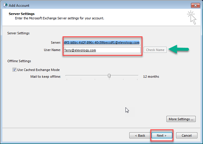 If you have entered the username and password correctly, the username will now be underlined, and the entry in the Microsoft Exchange Server field will also be underlined.